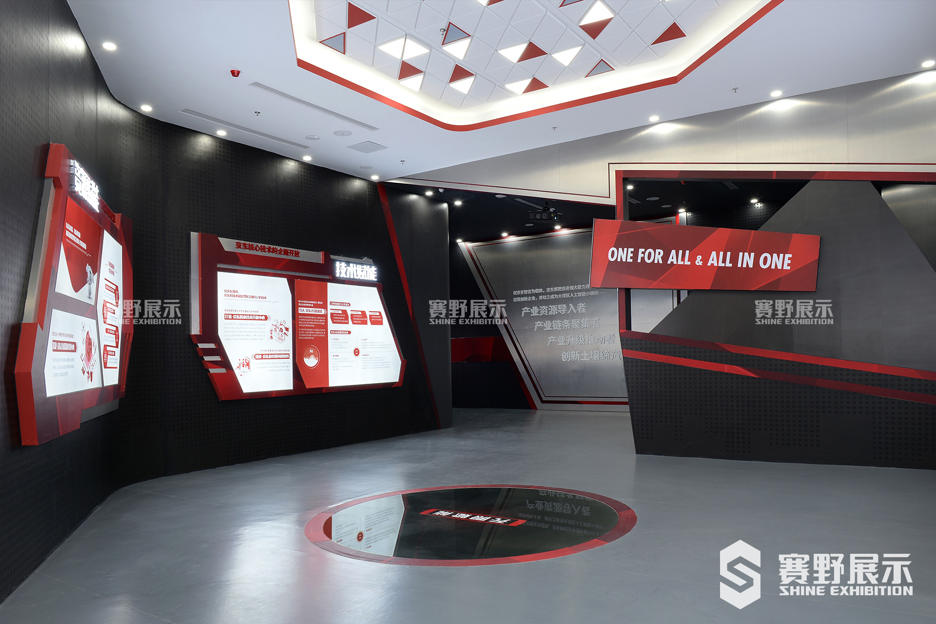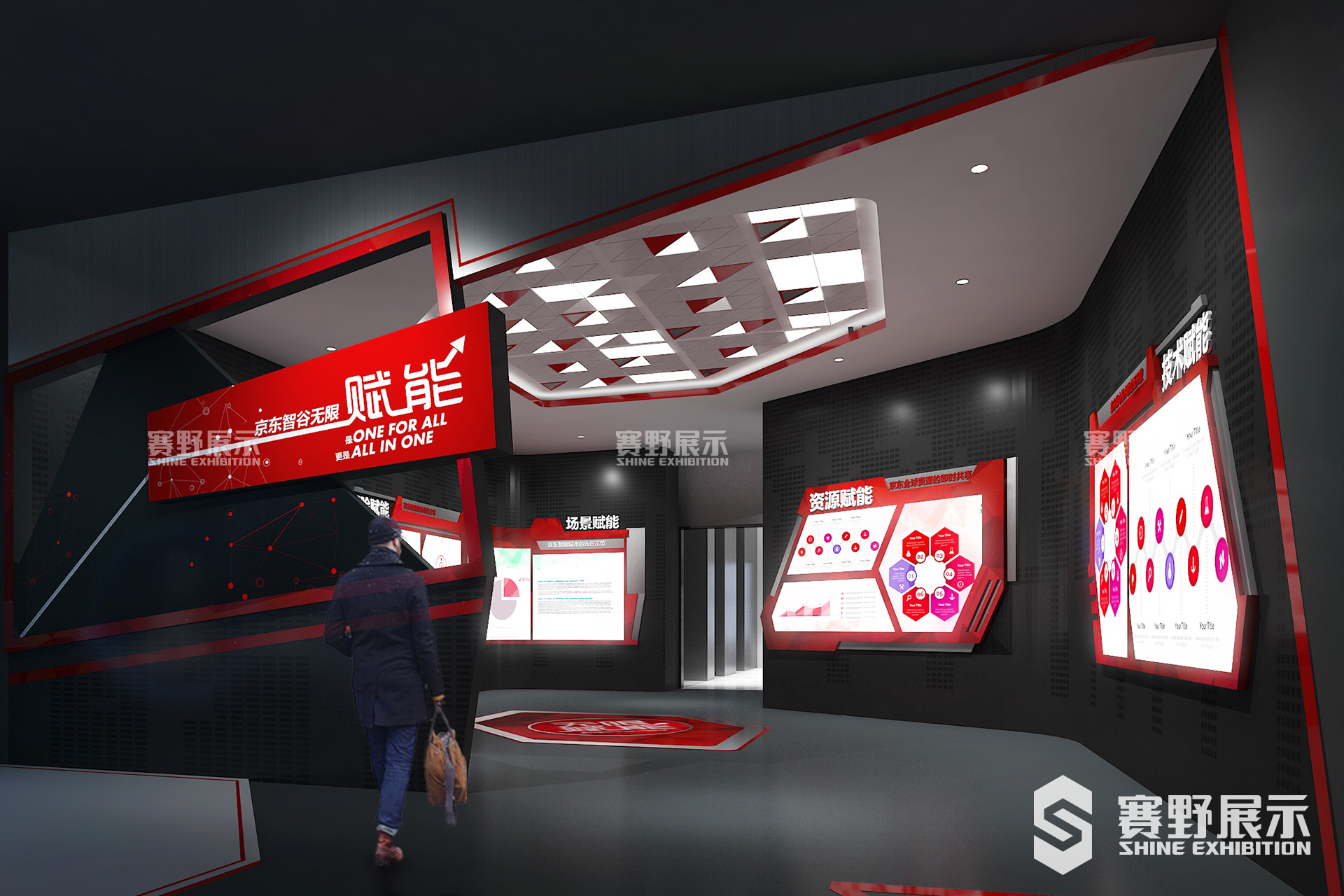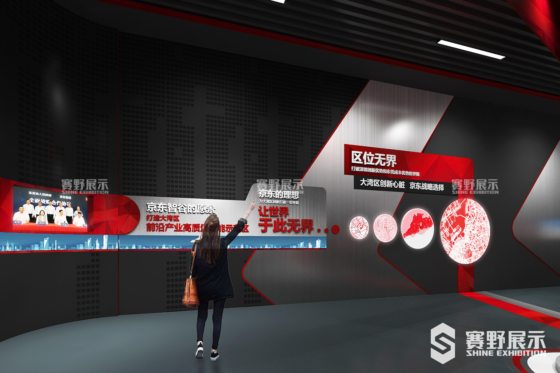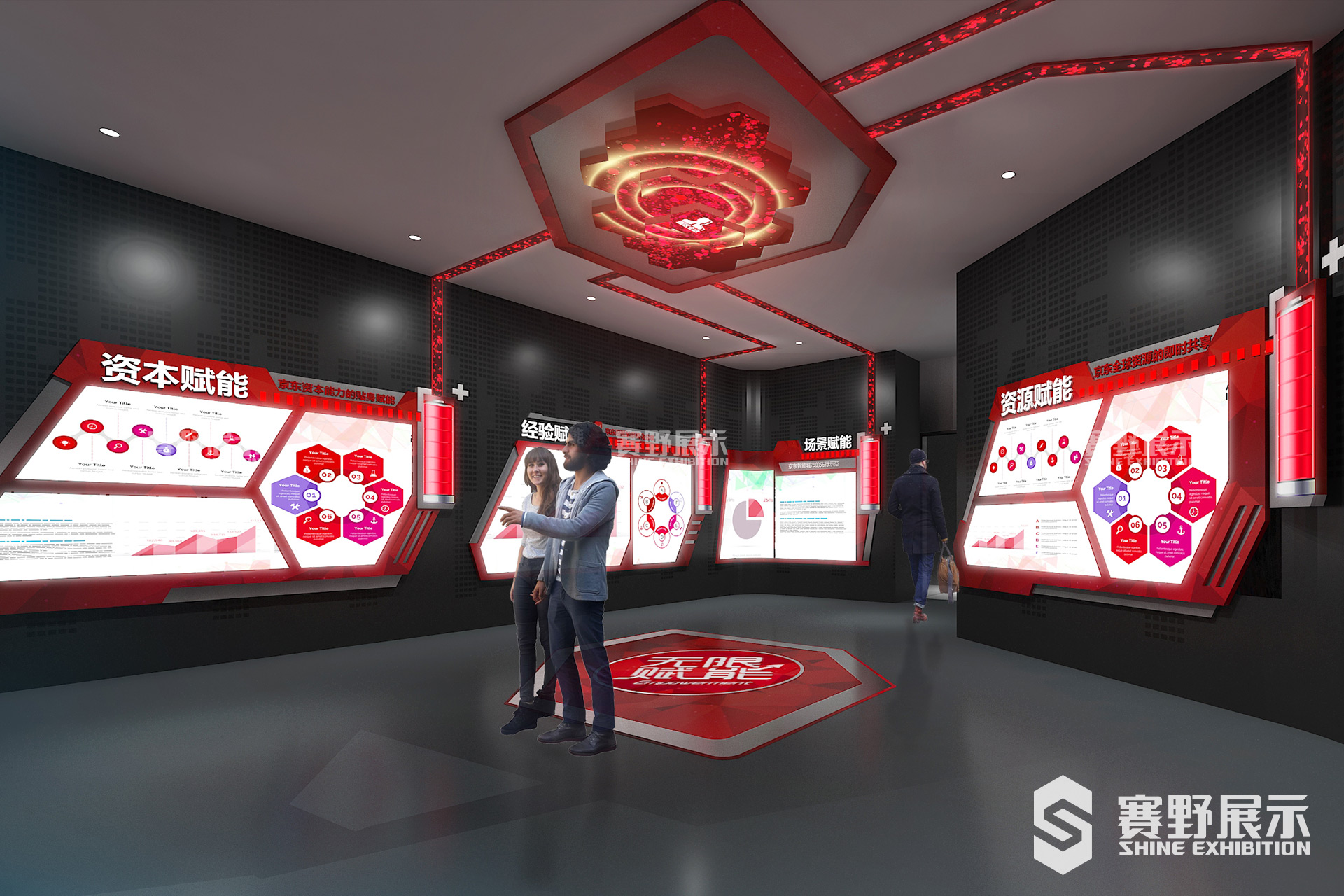 赛野展示根据京东智谷的主色调进行延展,使色彩语言倾向于强烈和醒目。红与黑的激烈碰撞,恰如其分的表达了“赋能”的激烈,在庄重的同时,赋予了空间鲜明的“宣言感”。并充分理解并贯彻京东智谷项目核心理念,突破传统陈列方式,完美展示京东智谷的空间。使京东智谷的规划愿景从冷冰冰的数据文字变成了生动可观的科技展厅,整体展厅空间动态设计富有未来科技感,带给观者视觉上的畅游及无限的想象。