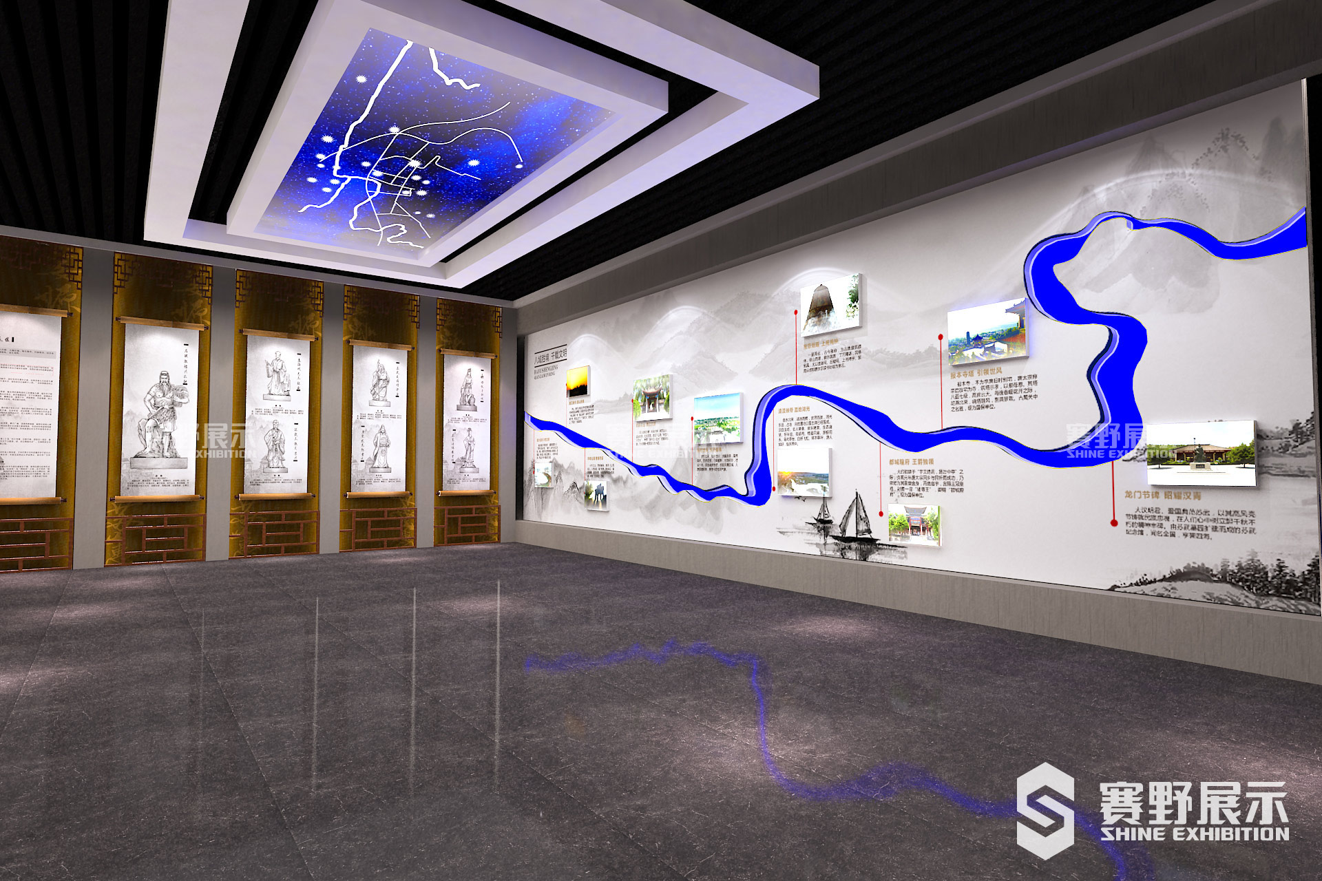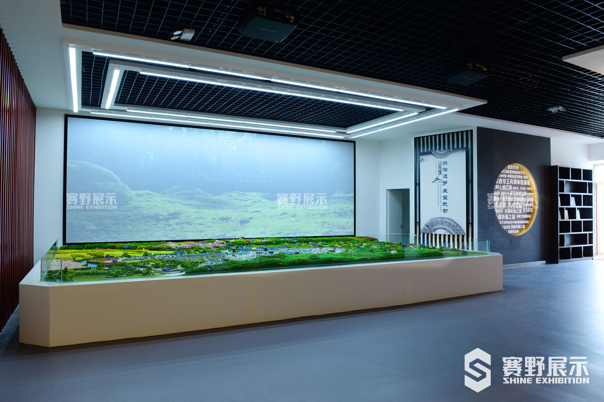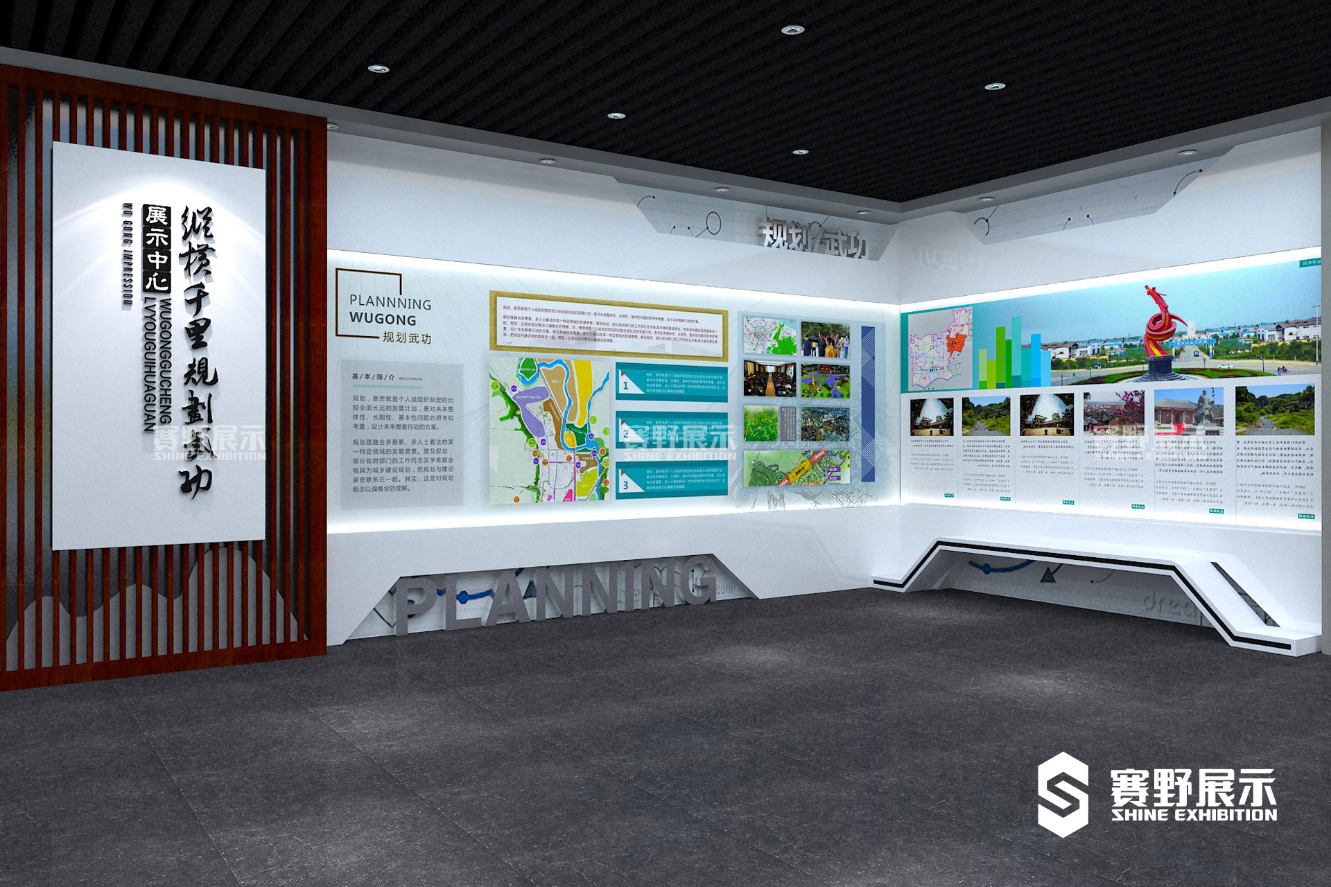 任何艺术的最终目的都在于创造,而展厅设计的创造性主要表现在创意的新颖和艺术形象的独创性。独特的形象给人以冲击、震撼、刺激,令人过目不忘,依次发挥最有效的宣传作用,实现最大化的城市形象传播。赛野展示在武功旅游规划馆设计中,以历史文化元素为空间设计的主要元素,打造古朴、大气、雅致的空间感,空间以在原有基础上进行设计排布,大气的方正行空间设计让整个展厅整合而统一、形态统一、色彩统一、格调合一,这是展厅艺术的首要标准。