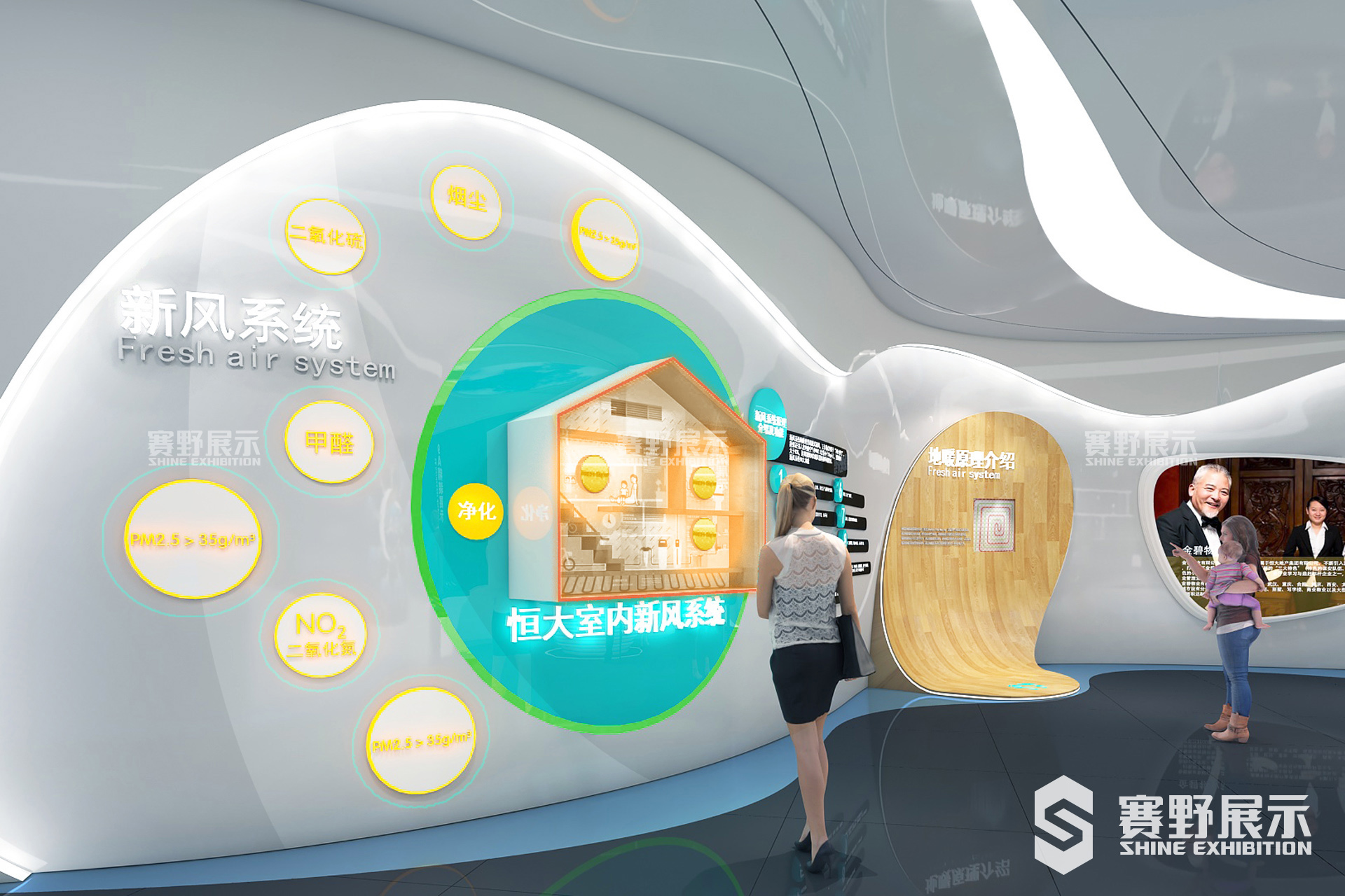 赛野展示以合肥市花桂花为创作设计元素,四片花瓣分别代表四季,左侧花瓣设置互动装置;设树叶状LED,四季分明。地面上设置互动投影体验,观者可以在湖面上与鱼儿嬉戏。设魔幻体验装置,观看到剖面的房屋模型中充斥着各种有害气体,当观者触摸“净化”、“新风”按钮,房间中空气瞬间清新、自然。在强烈的对比中,充分展示出有无新风系统的巨大差别,生动传递出恒大地产的卓越品质。