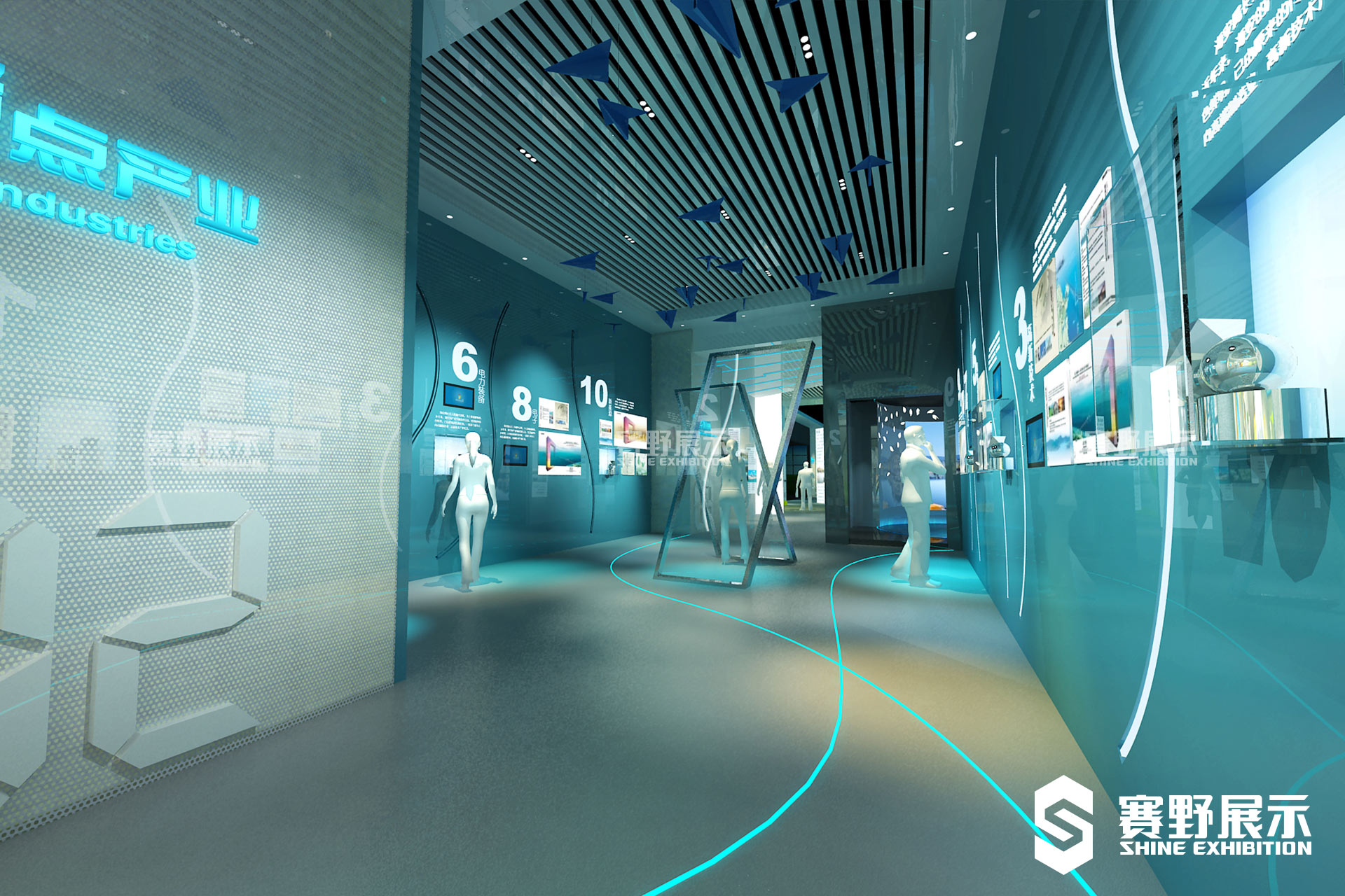 展馆的主要展示内容位于一层,布展面积约为4000平方米。主要运用了全国首创“五位一体”数字沙盘、4D影院、360°全息成像、互动屏与互动球幕等高科技展项。展馆负一层主要用于临展等功能。