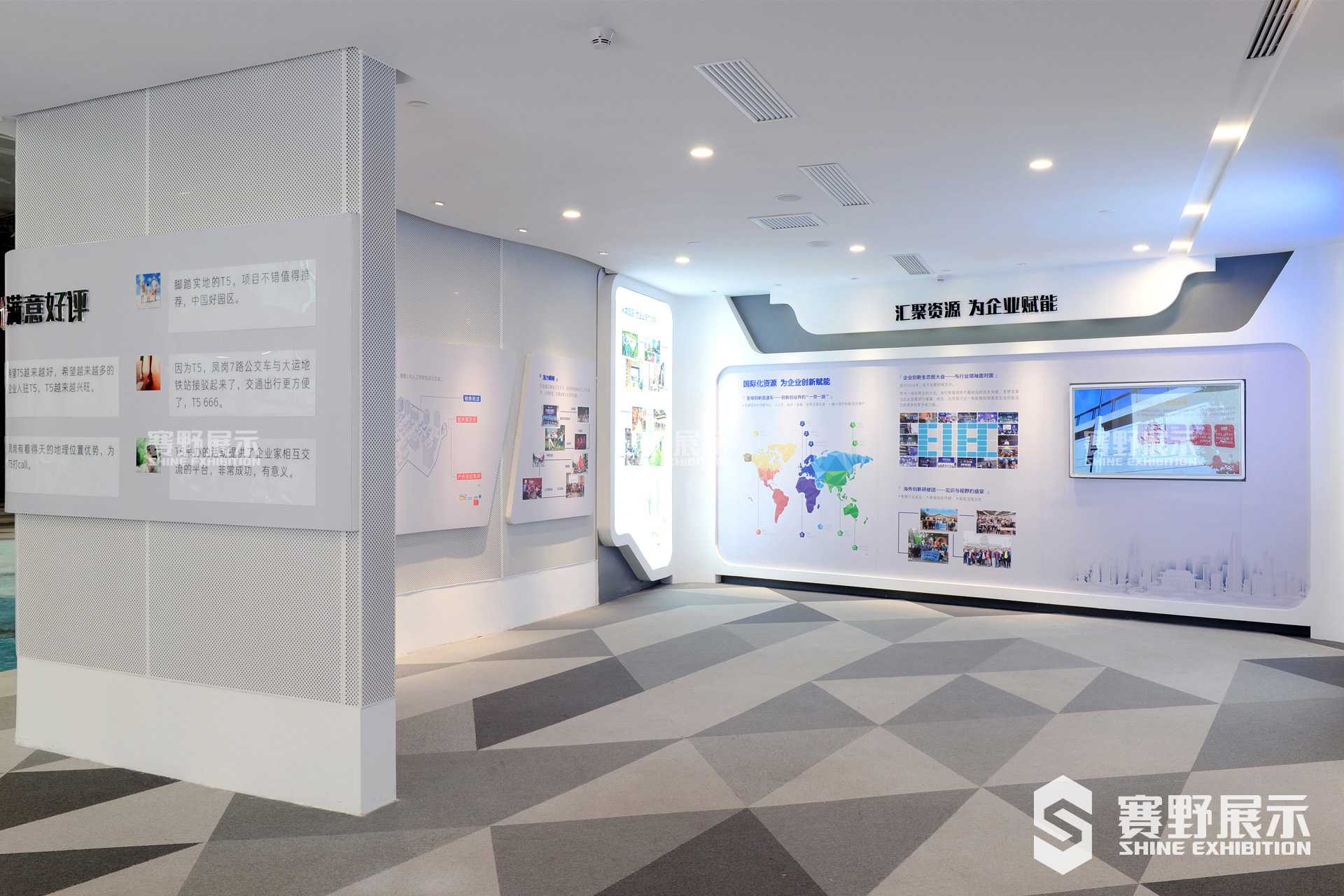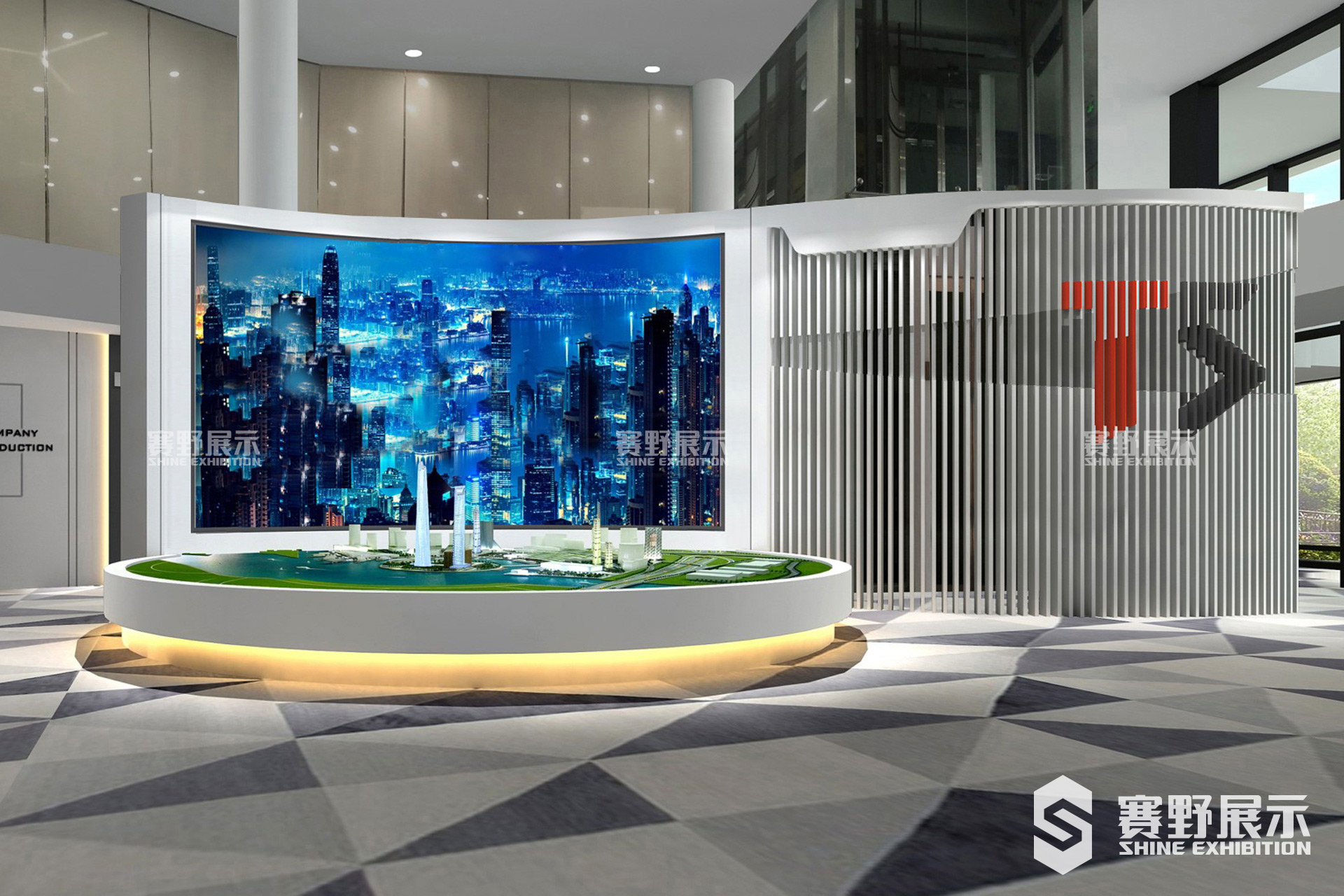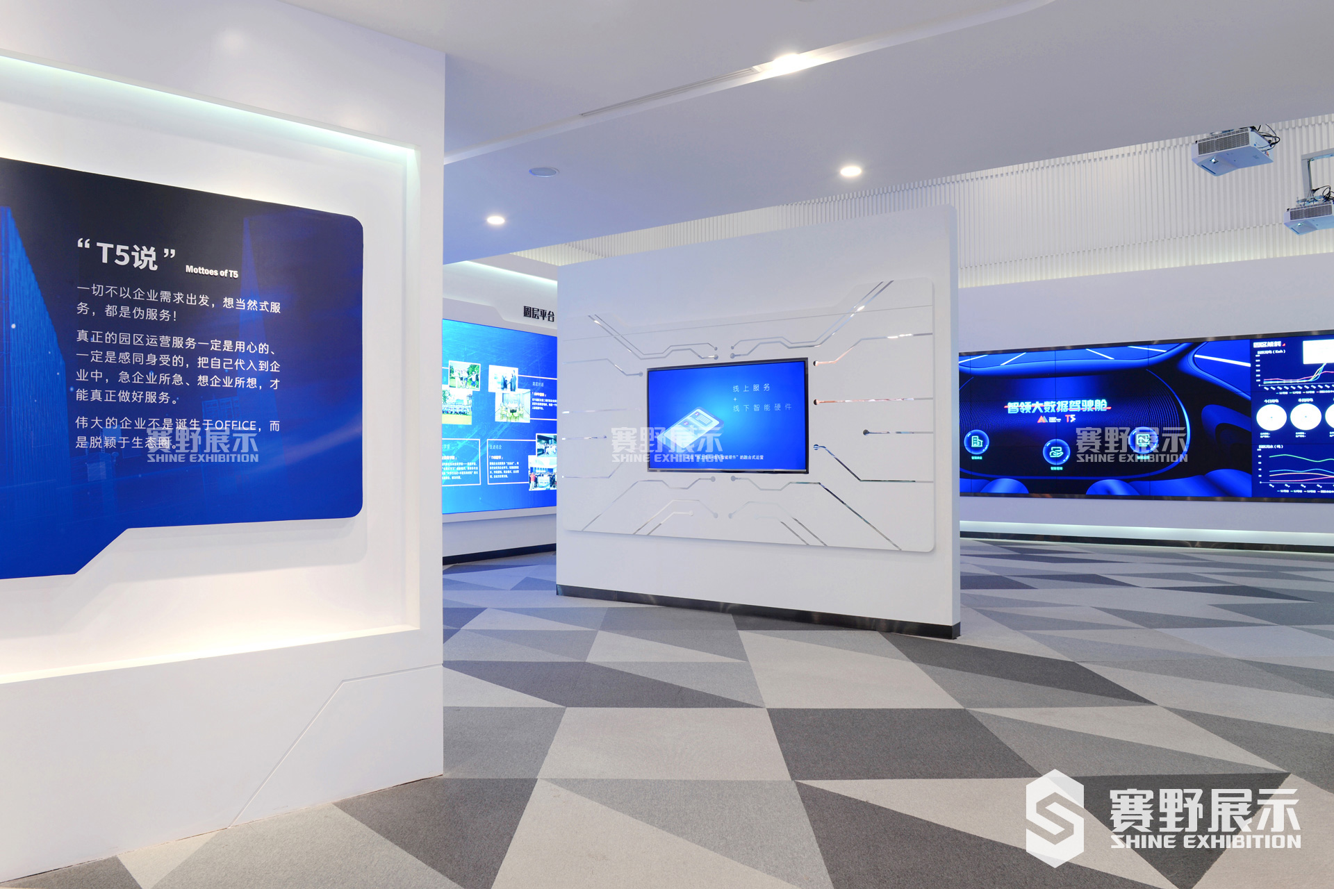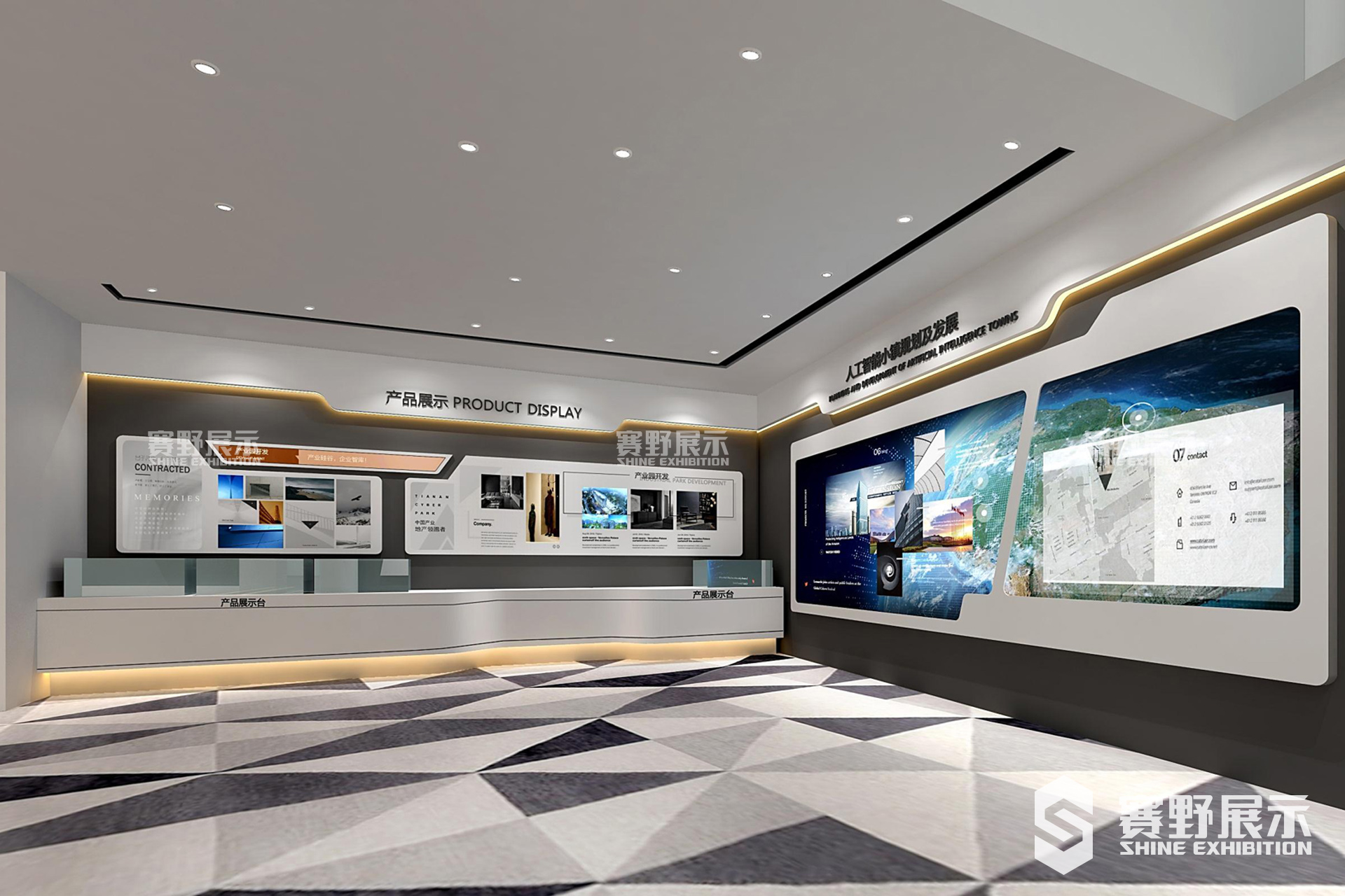 赛野展示根据凤岗T5天安数码城“智慧、创新、责任、开拓、未来”的理念,以独特的设计,从外到内为凤岗天安数码城T5打造了集“咨询台、项目沙盘区、集团展示区、人工智能小镇、智能园区、国际化资源整合能力及园区人文关怀、LED屏幕影片播放、形象合影区域”为一体的凤岗T5天安数码城展示厅。