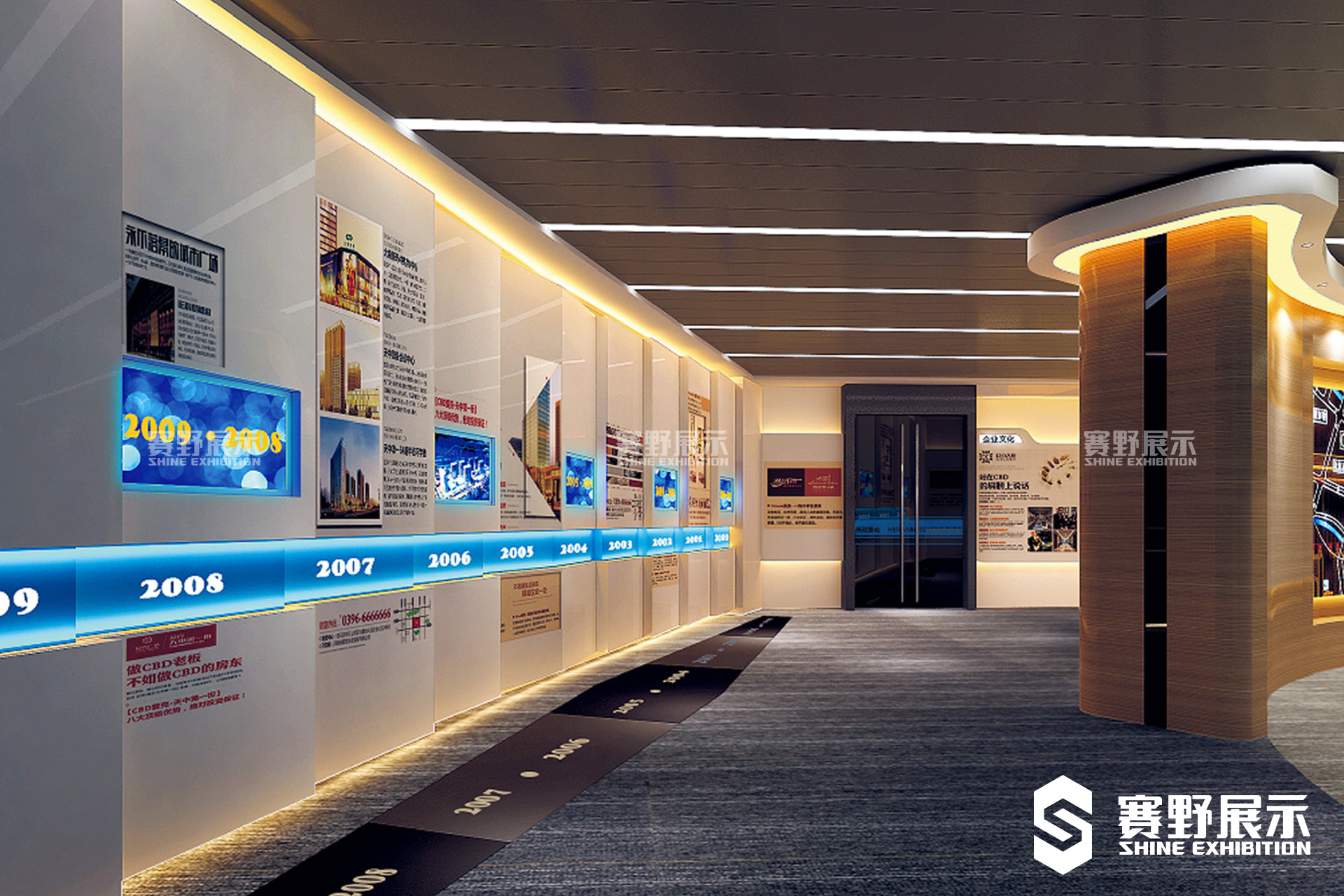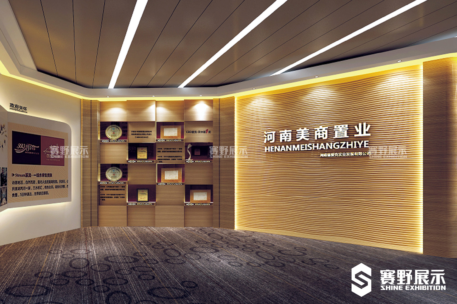 展馆主要展示企业的综合型及河南美商置业的国际化,以及未来的规划及其战略。将展厅分为:企业形象展示区+未来战略展示区+精品项目展示区+品牌阵营展示区。使用各种形式的概念墙面来表现企业的实力及企业科技国际化的前景,如壁挂精品沙盘墙、LCD液晶拼接墙搭配电控智能调光玻璃,使展馆呈现出美轮美奂灯光科技感。整个展馆的设计简约温和,给参观者带来非同寻常的视觉体验。