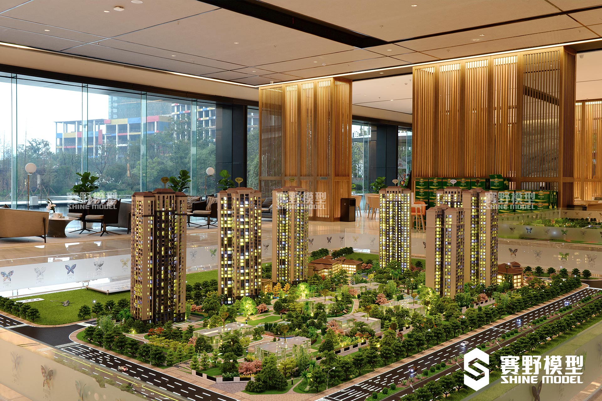 建筑展现出现代东方,艺术自然的效果,墙体搭配条纹结合玻璃幕墙,与沙盘模型的结合,在空间中展示不同的艺术。赛野模型公司采用雕塑化手法塑造模型细节,造出一片尊享天地。设计者用最合适的空间关系营造情绪,将展厅模型与观者的关系完美结合。