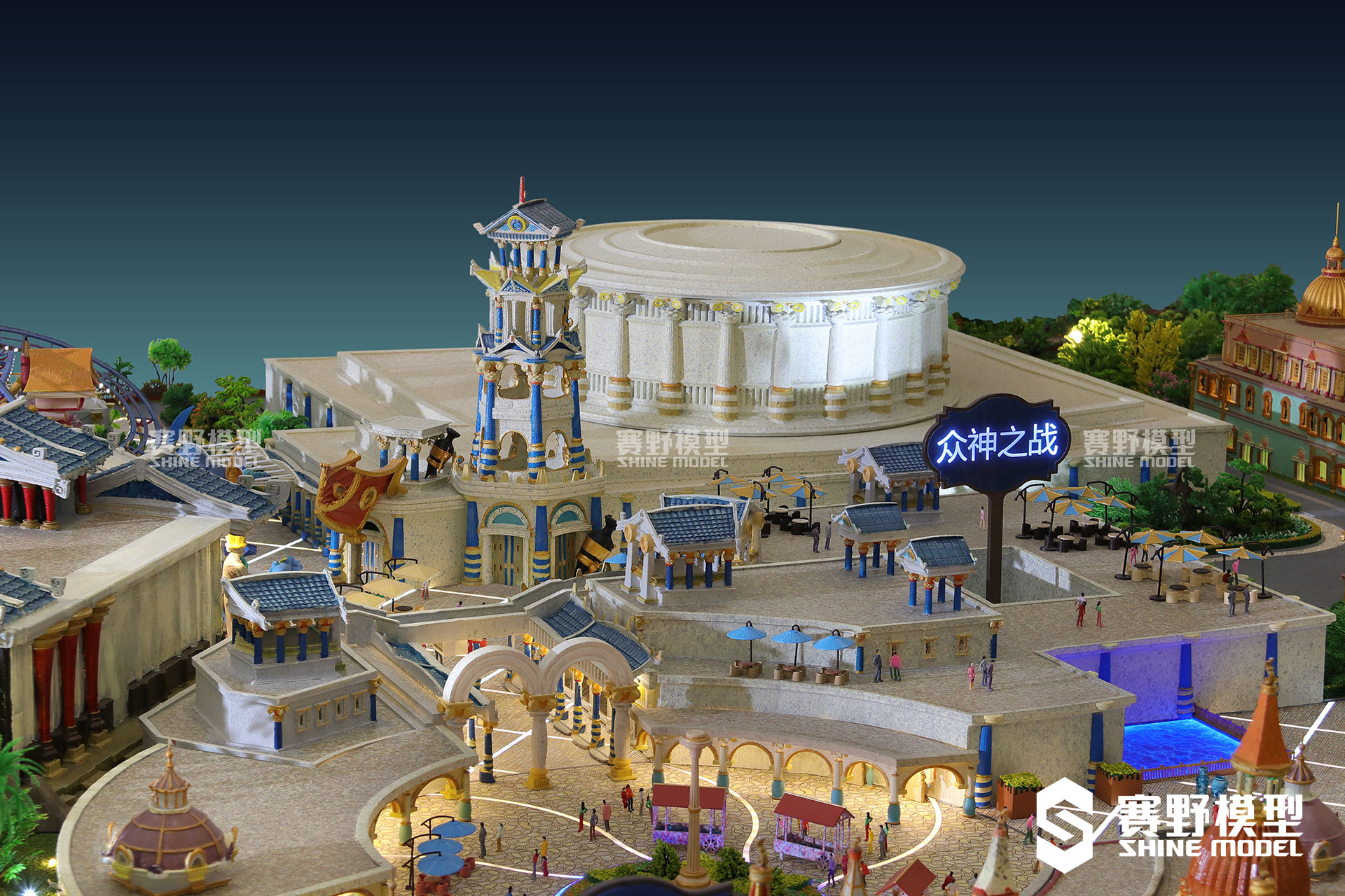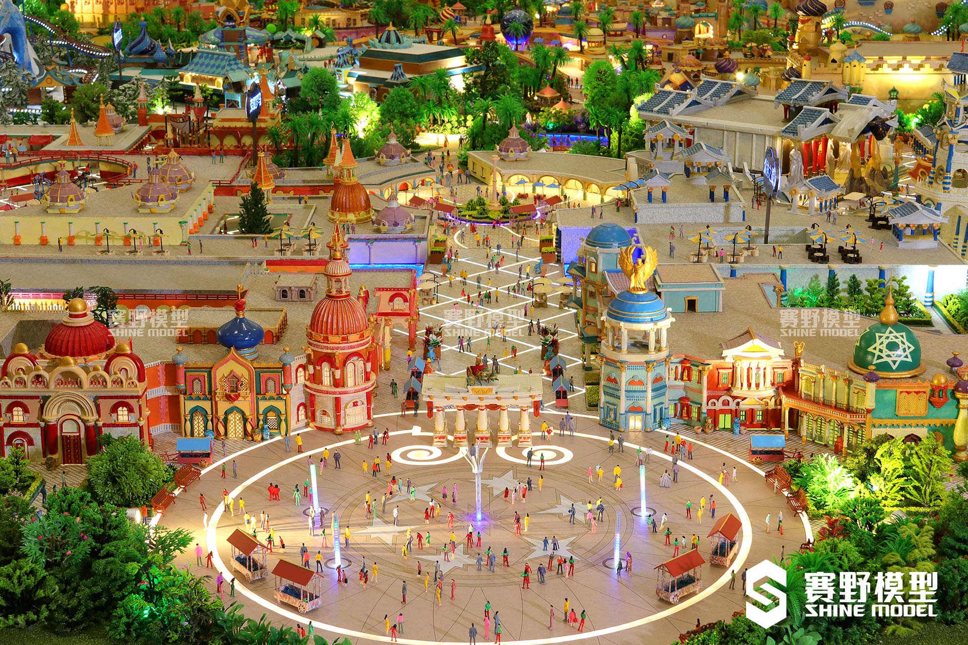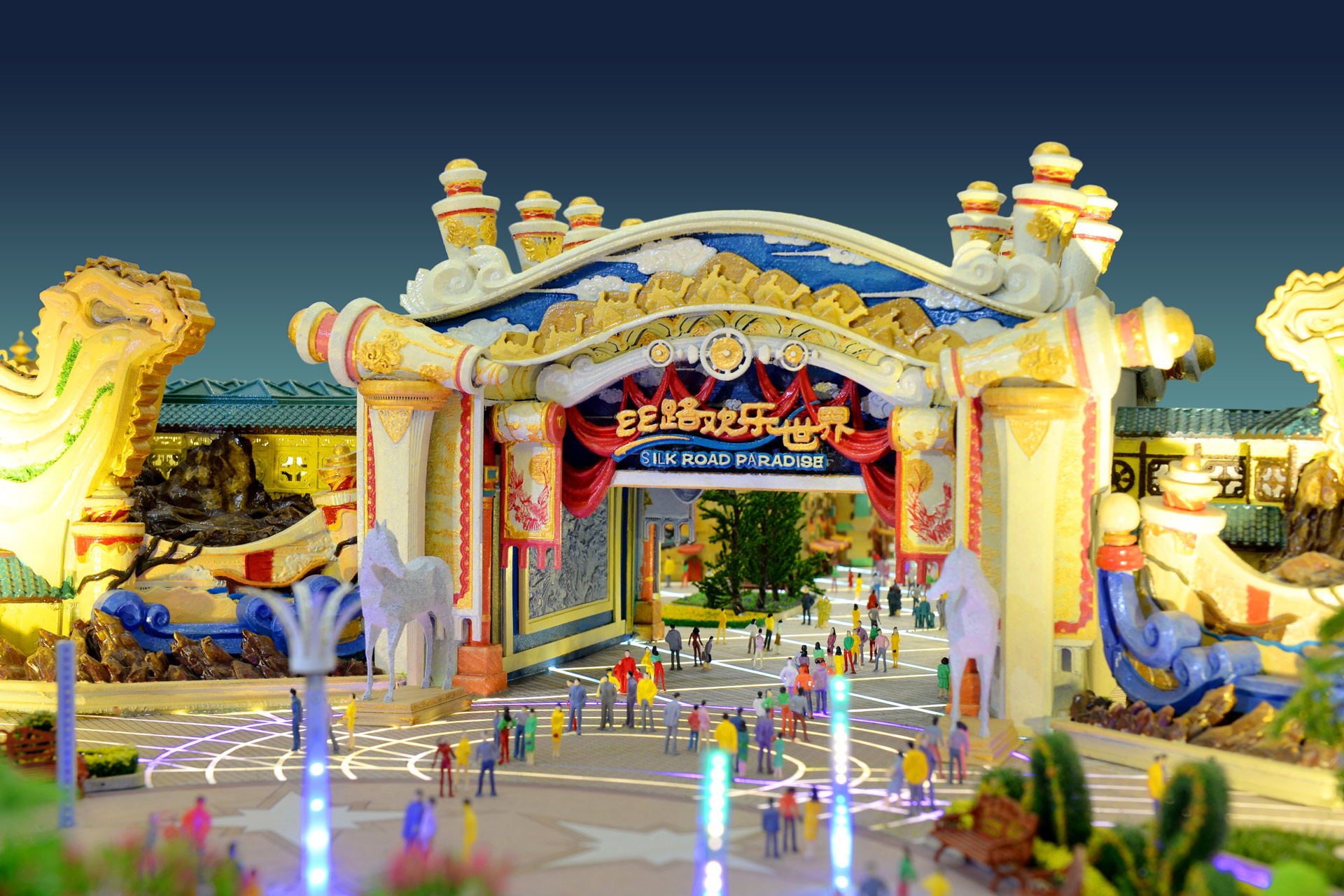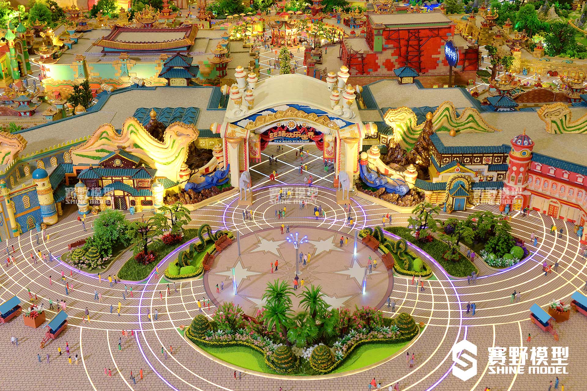 丝路欢乐世界项目采用3D打印技术及异形建筑,马路采用亚克力创作,美观且防水。赛野模型公司特地使用钢琴烤漆,耐污染耐老化,环保无毒且漆面光滑平整,整体高雅大气,带给观者最真实的视觉感受。