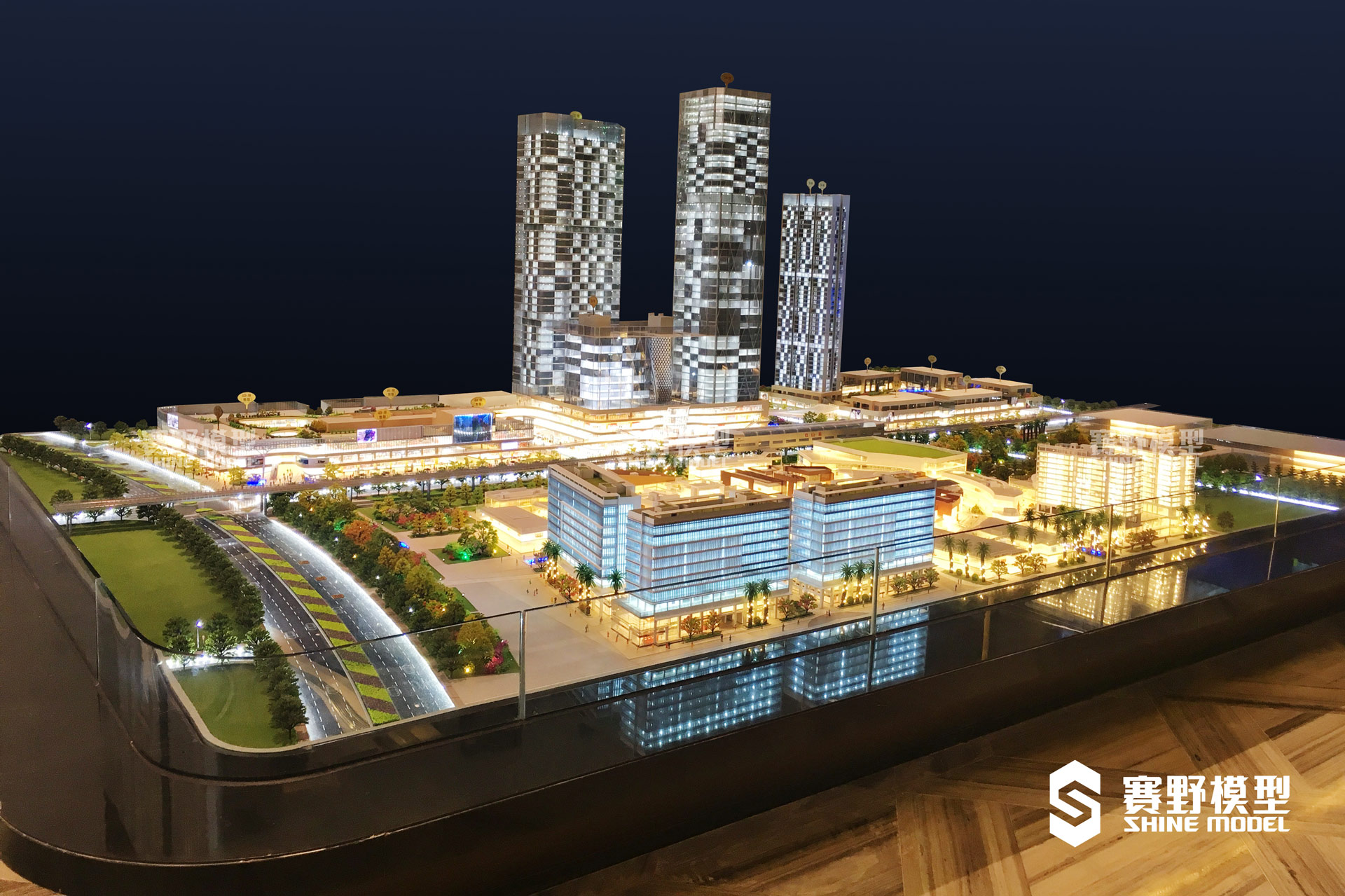龙光玖钻项目作为现代化标志建筑,赛野模型以体现建筑立面结构、整体形态为宗旨,照明手法以点线面相结合的方式表现,从而突出项目的品质感。所有建筑楼赛野模型采用日产“SL-ABS板”制作出模型内部骨架,3M镀膜玻璃制作成建筑外立面玻璃幕墙,以此达到了通透采光的效果。